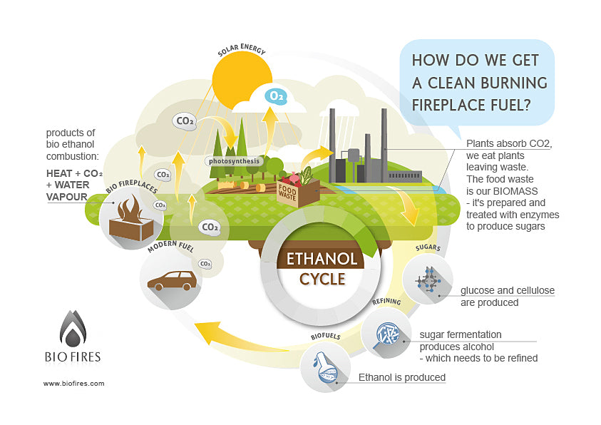 Plants absorb Carbon Dioxide from the atmosphere. We use those plants as food and when processing food, there is food waste. With a little help of chemical enzymes, the biomass releases sugar and then natural microorganisms continue with the fermentation of the sugars, producing biofuel. Bio fuels have many uses in today’s world, including fuel for bio cars or machines, within the cosmetic industry or eco-friendly home heating with bio ethanol fires.