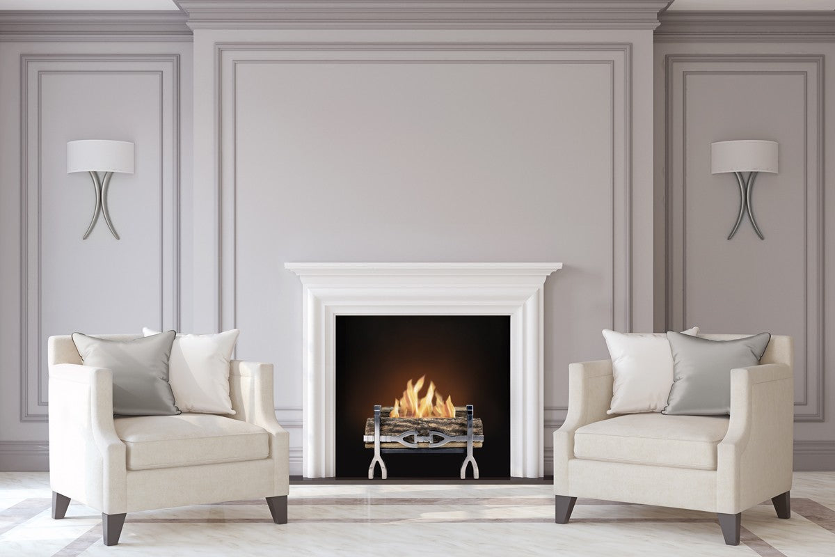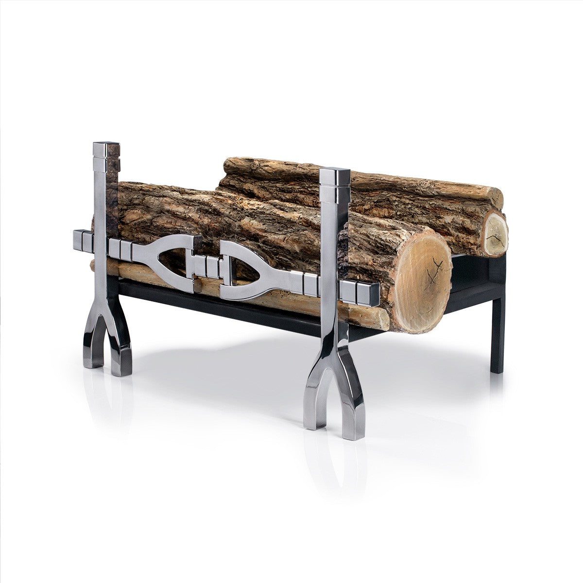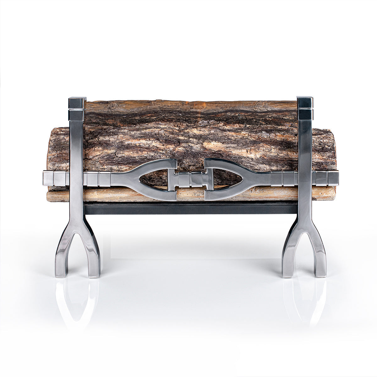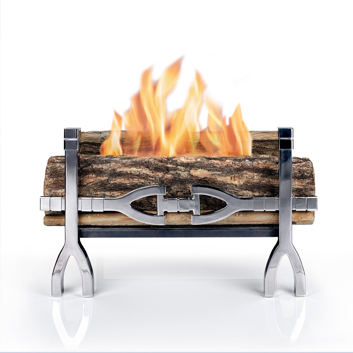Designer fire basket for high-end residential and commercial spaces. Stunning bioethanol fire grate in mirrored finish with highly realistic handcrafted logs. Instant warmth with a real roaring fire up to 7 hours burning time.