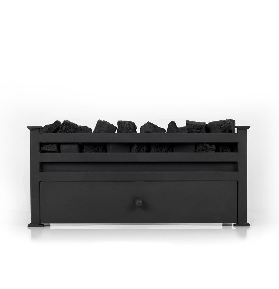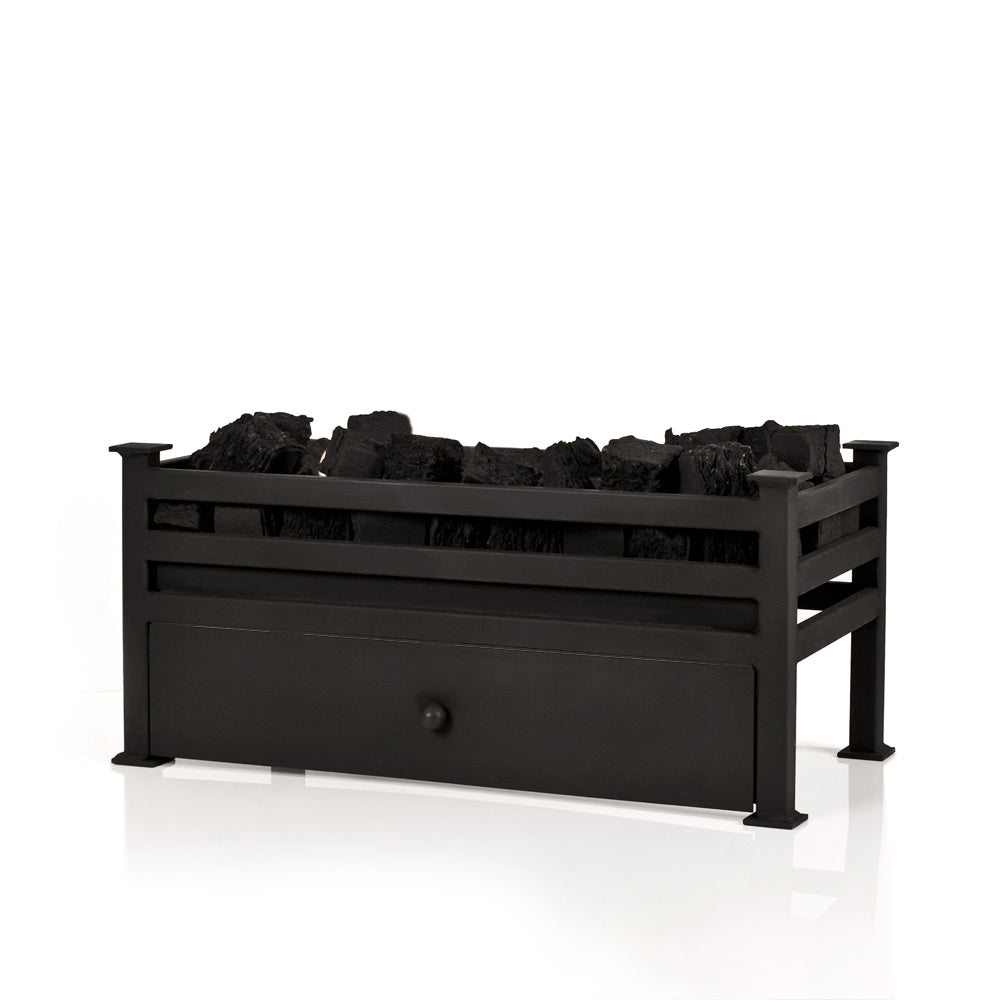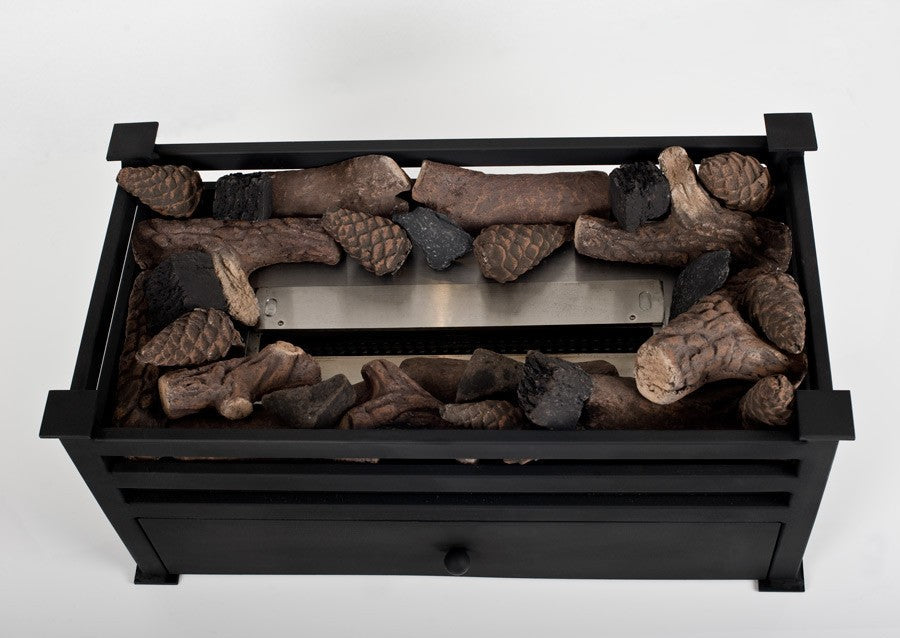 Made of steel with Black Satin painted finish, the fireplace features a decorative drawer underneath.