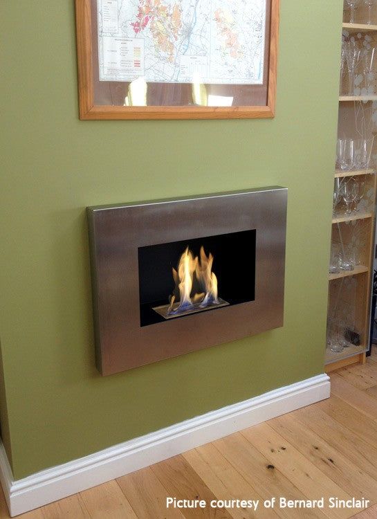 An elegant brushed stainless steel bioethanol fireplace. Can be simply hung on the wall like a heavy mirror or inserted into a recess. Enjoy the smokeless real fire without a chimney for up to 4hrs from one refill.