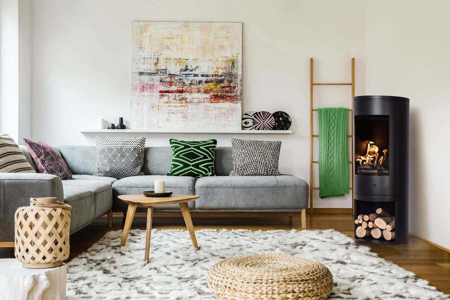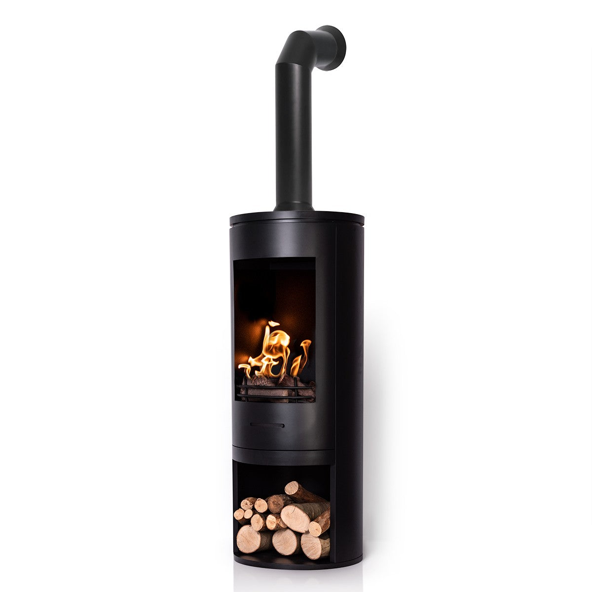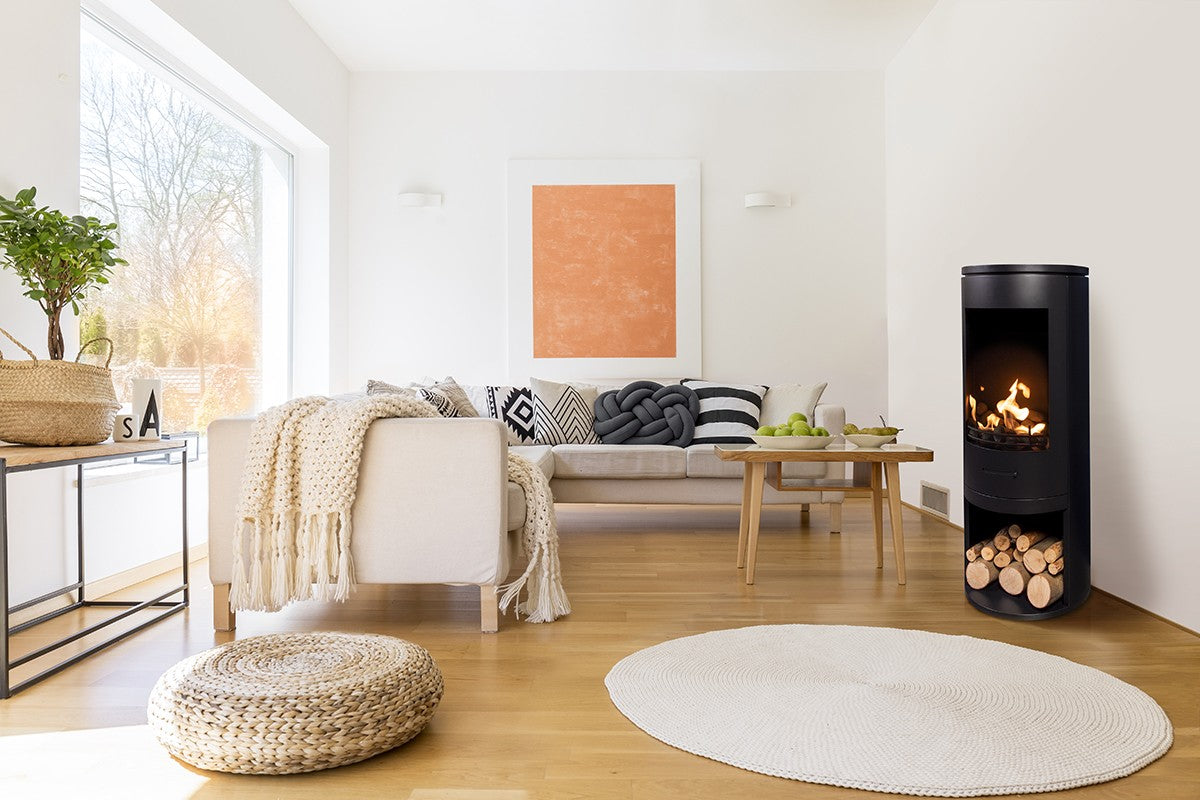 The Cylinder Stove can be positioned anywhere in your room against a flat wall as a freestanding unit and used with or without the pipe.