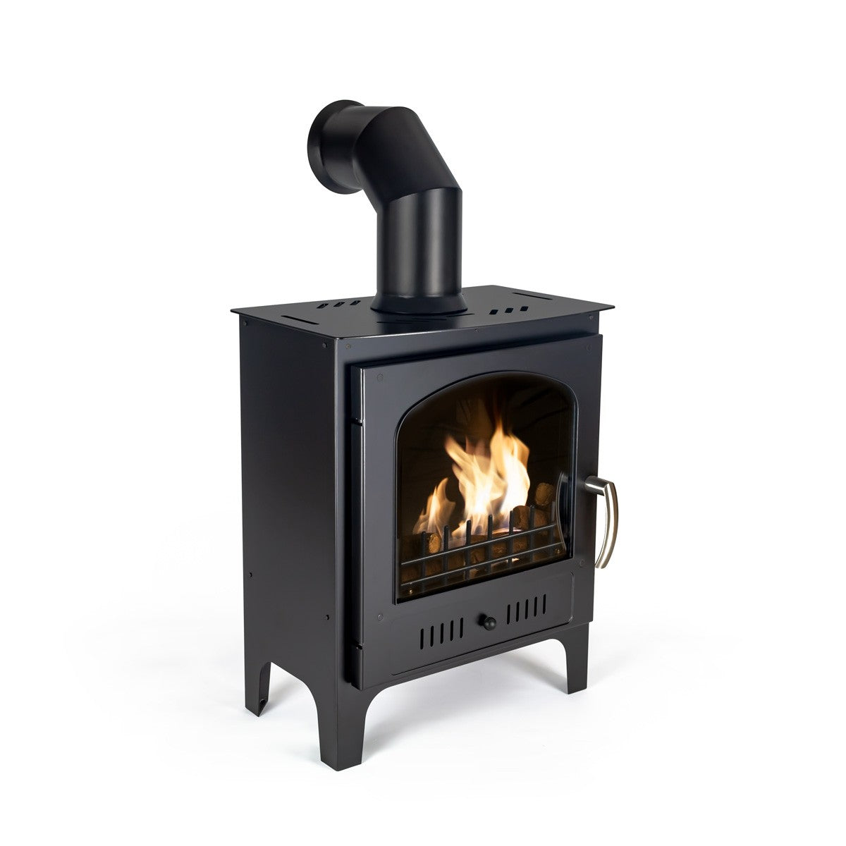 Alternative to a wood burning stove or an electric fire. The perfect solution for bringing the magic of a traditional wood burner into your home without the need for a chimney or flue. No smoke, no installation, no maintenance. To create a more authentic experience, small real logs can be placed underneath the stove and a faux pipe can be used.
